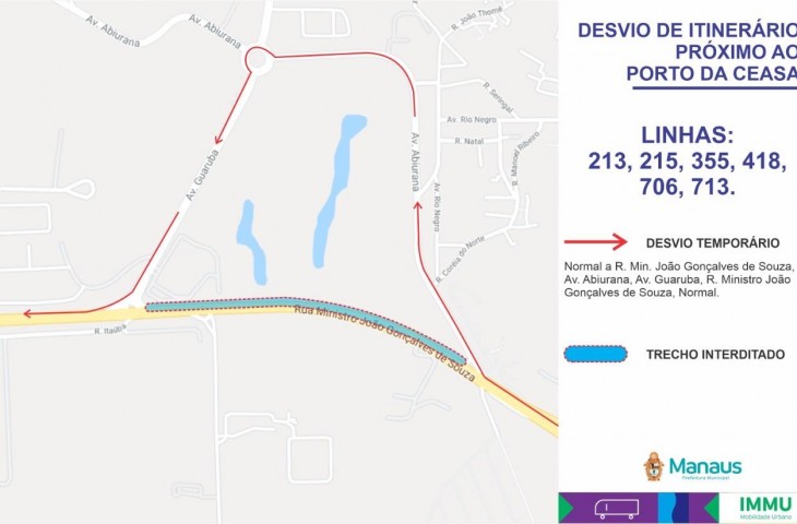 As linhas de ônibus 213, 215, 355, 418, 706 e 713 no sentido bairro/Ceasa vão seguir pela avenida Ministro João Gonçalves normalmente, para o sentido Ceasa/bairro, depois pelo desvio, até acessar a avenida Ministro João Gonçalves.