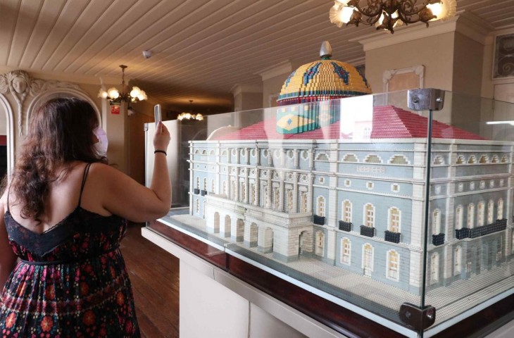 O visitante ainda confere uma maquete do Teatro Amazonas, feita com blocos de Lego, uma escultura de bronze do artista francês Adrien Étienne Gaudez, além da Saleta de Exposição da Cúpula, com itens como vidros coloridos, telhas esmaltadas e vitrificadas e projetos arquitetônicos do Teatro e sua cúpula.